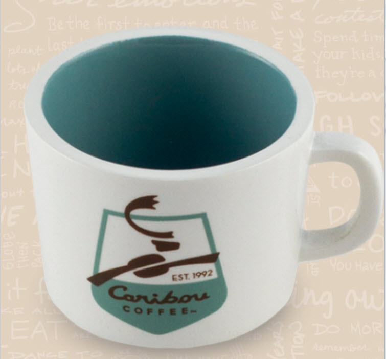 Classic Caribou logo ceramic white mini mug with red satin hanger