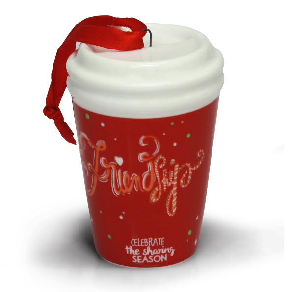 Seated in a red box this little Be Merry Ceramic Holiday To Go Cup ornament is even better looking in person.